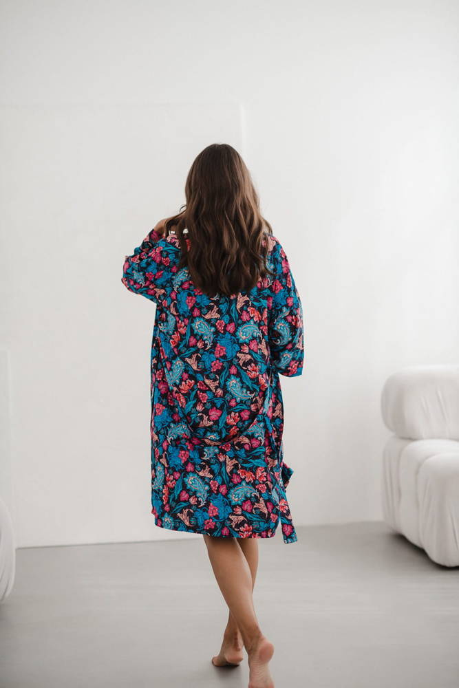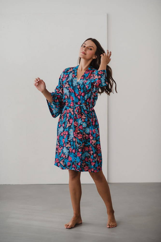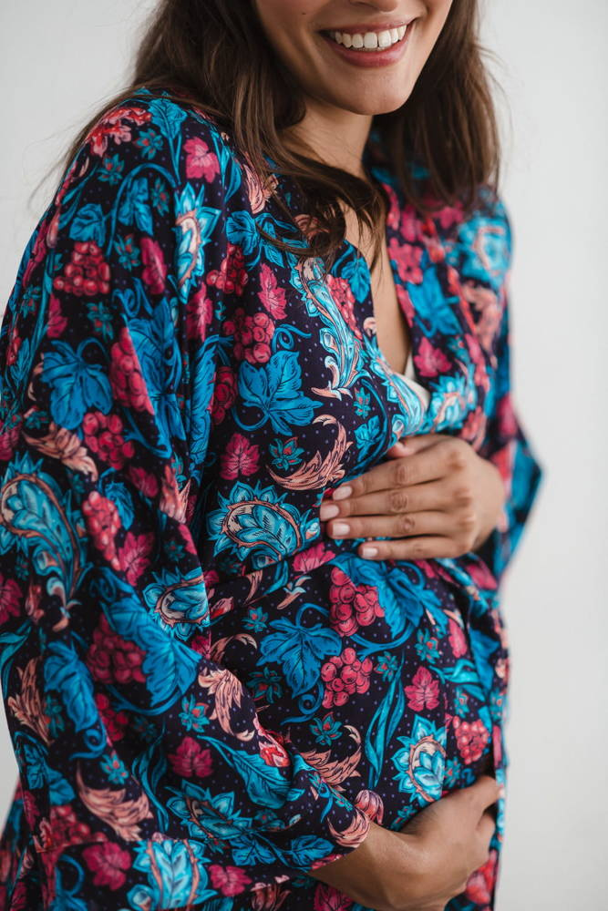 Szlafrok został zaprojektowany z myślą o mamach, dlatego jest nieco dłuższy, abyś spokojnie okryła nim ciążowy brzuszek. Po porodzie bez skrępowania b będziesz mogła spacerować po szpitalnym korytarzu lub na leżąco nakarmiła maluszka w połogu. Posiada kieszenie na niezbędne drobiazgi i pasek do regulowania szerokości.
