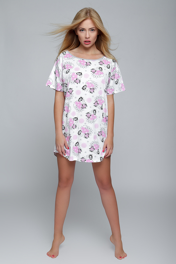 Camisa de mujer de algodón 100% de alta calidad que, combinado con el corte holgado, proporciona la máxima comodidad de uso. Garantiza una total libertad de movimientos. Original escote oversize de gran tamaño, se puede deslizar de forma sexy por encima del hombro. Camiseta de manga corta, decorada con un dibujo de pingüinos. Acabado semicircular en la parte inferior. Atraerá a las mujeres amantes de la suavidad y la libertad.