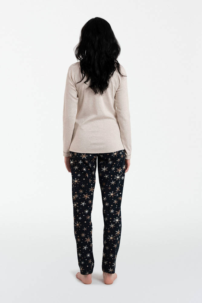 Los pijamas de mujer de moda son ideales para viajes de negocios y vacaciones, así como para estar en casa. Su corte sencillo y clásico es una garantía de comodidad y libertad, y el material natural proporcionará un confort térmico adecuado en las noches frías. El pijama de algodón para mujer, de pantalón largo y manga larga, está rematado con un escote redondo, bajo el cual hay un lazo decorativo y encantador y un bonito dibujo de copos de nieve. Un pijama tan femenino promete una noche de sueño placentero. El pijama de mujer está disponible en las tallas S a XL y en tonos negro y beige melange.