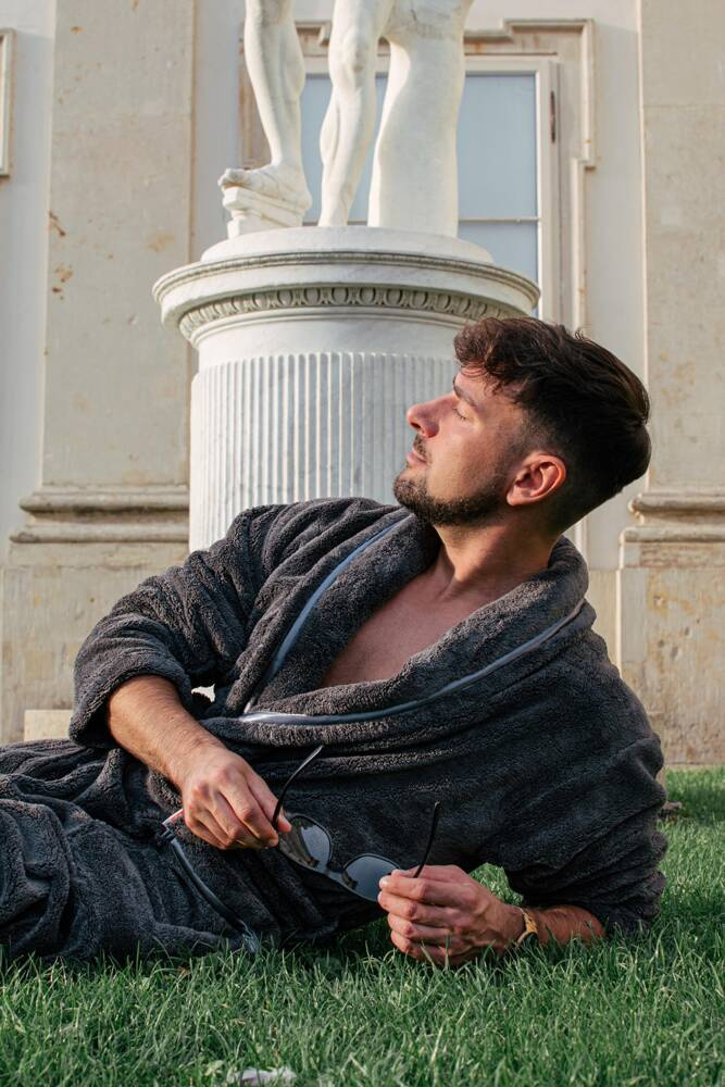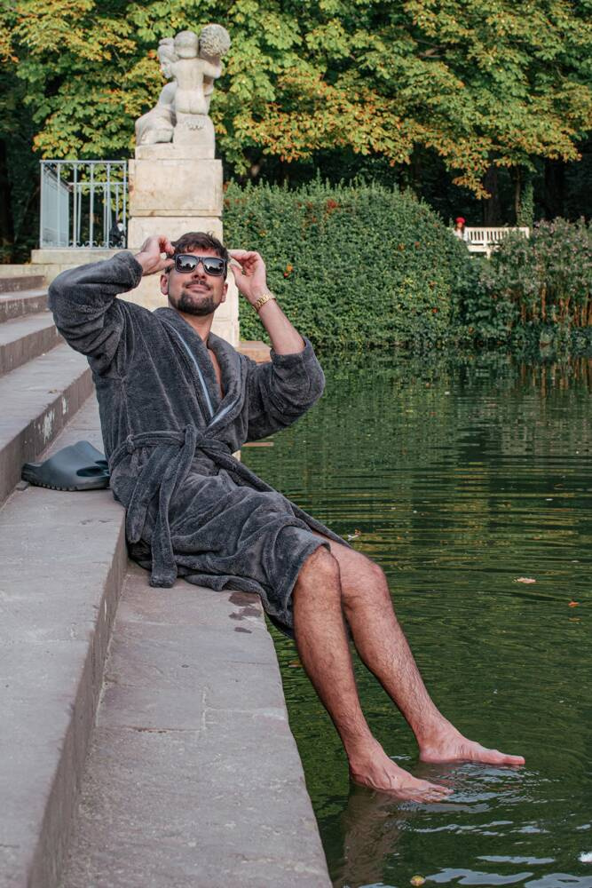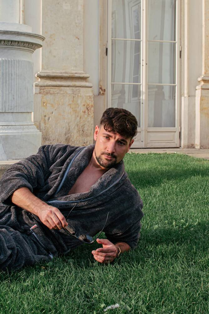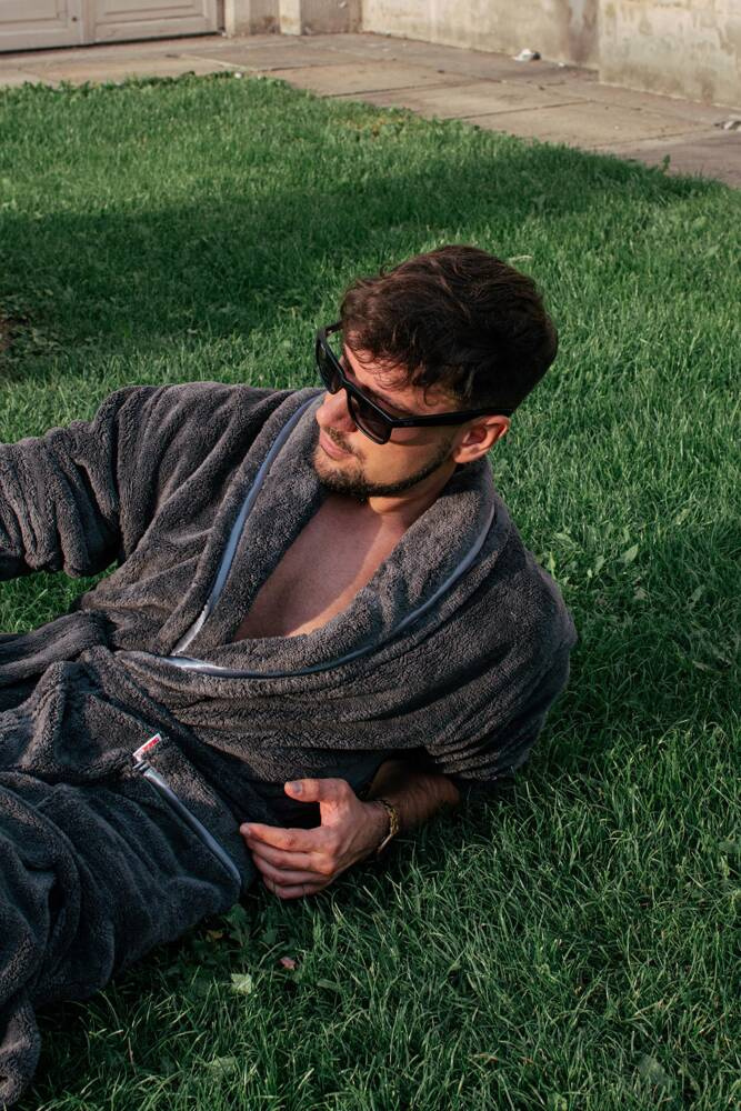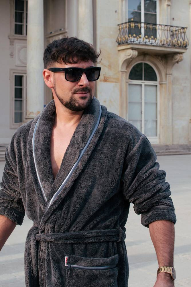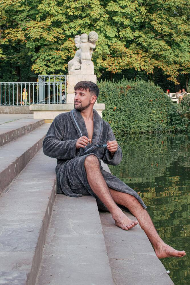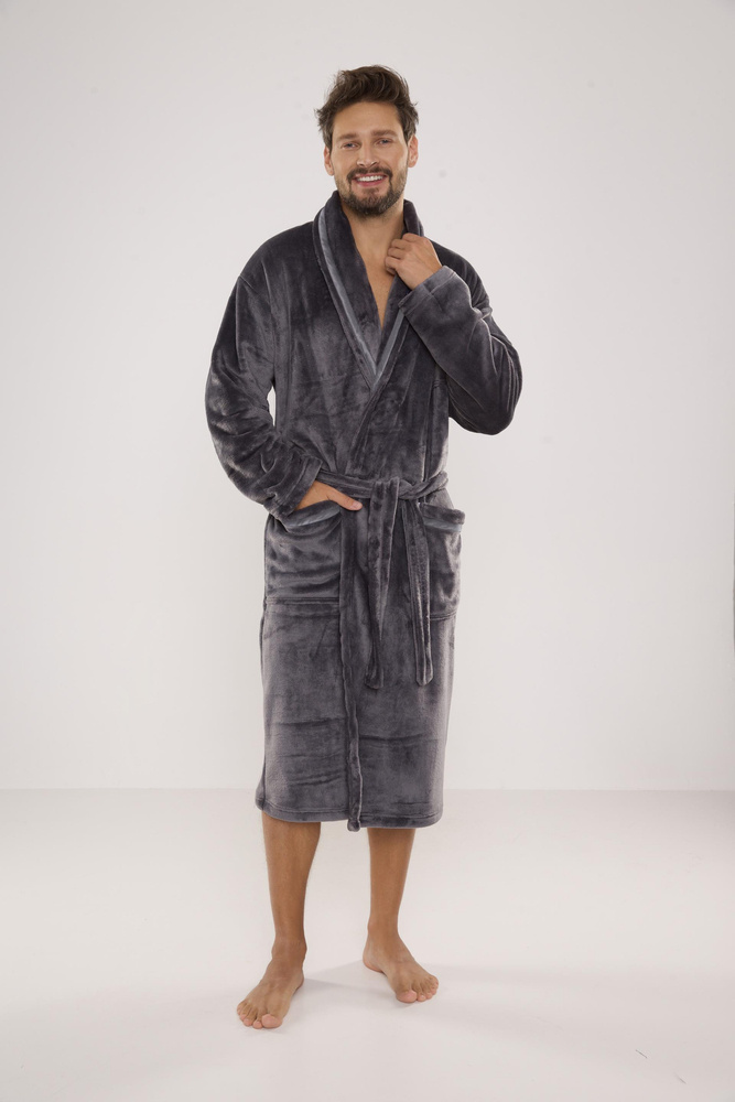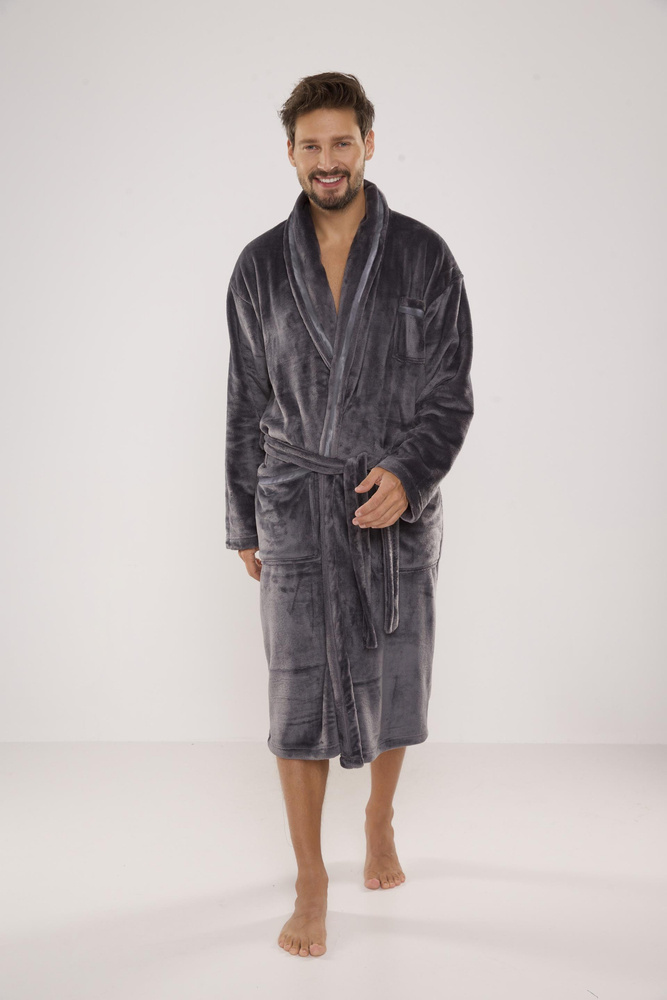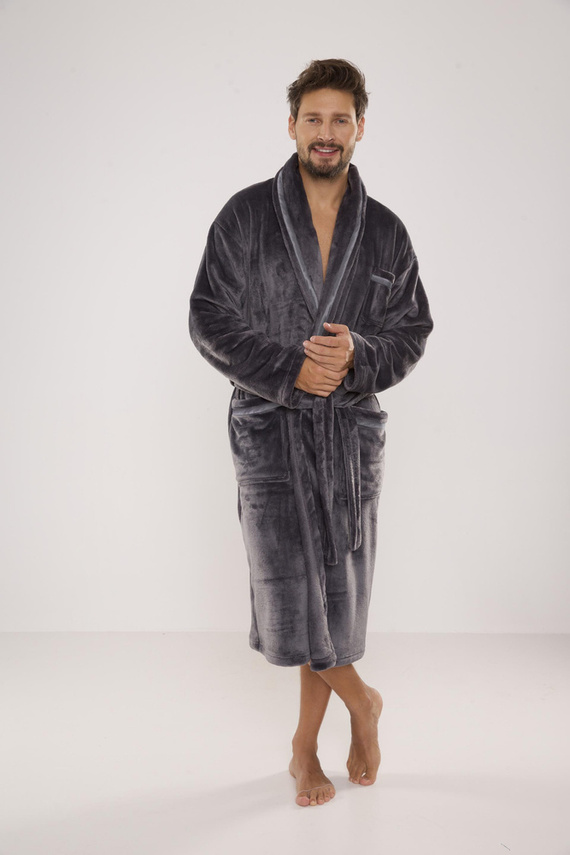 Albornoz largo de punto suave para hombre. Anudado a la cintura, bolsillos exteriores en las caderas, bolsillo de parche a la altura del pecho. Agradable al tacto, garantiza la comodidad de uso. La principal ventaja de este modelo es el tejido de felpa, cálido y agradable al tacto, que absorbe perfectamente el agua.