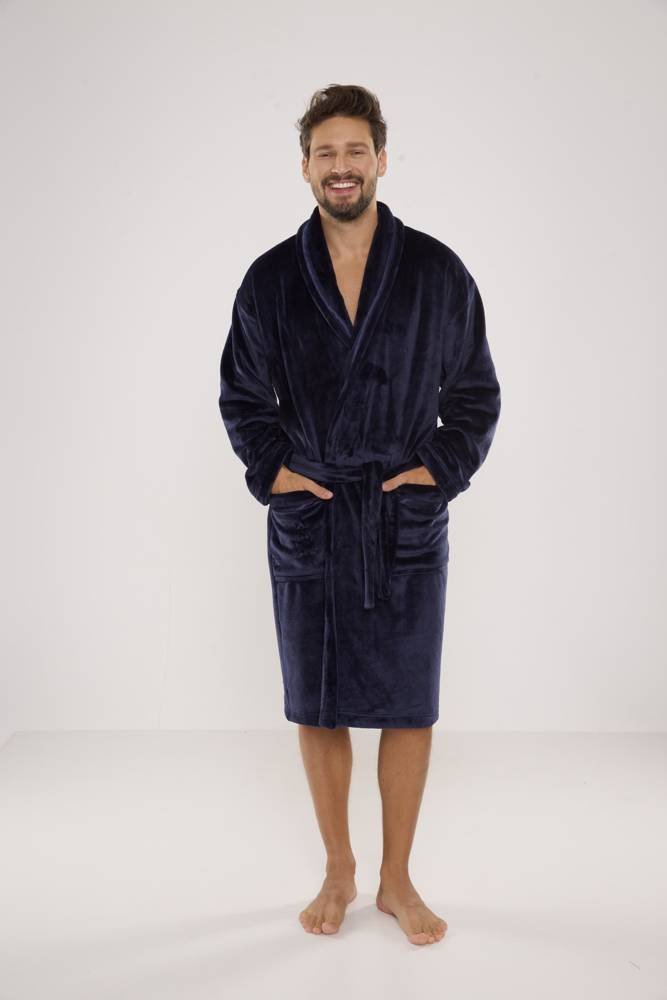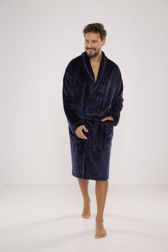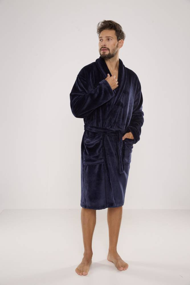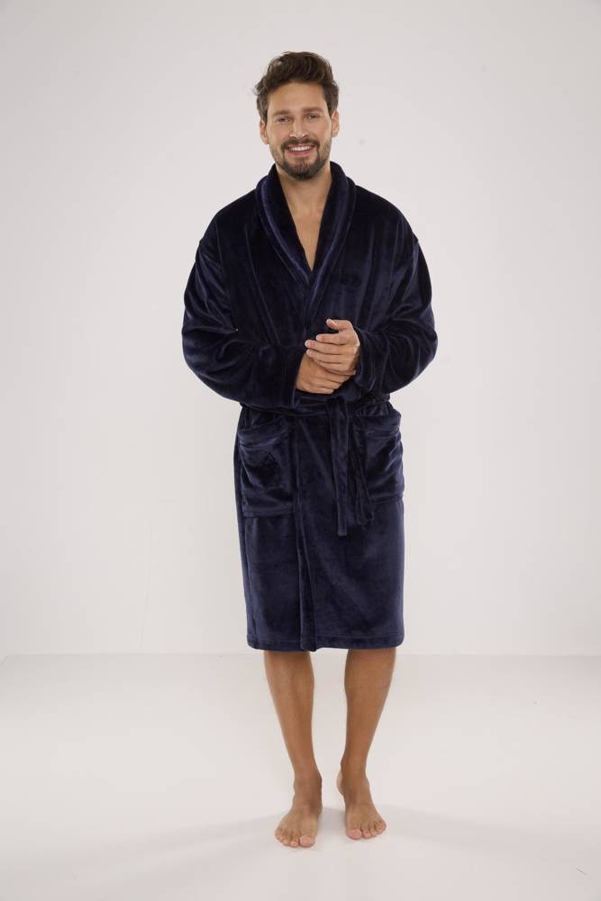 Albornoz largo de punto suave para hombre. Anudado a la cintura, bolsillos exteriores en las caderas, bolsillo de parche a la altura del pecho. Agradable al tacto, garantiza la comodidad de uso. La principal ventaja de este modelo es el tejido de felpa, cálido y agradable al tacto, que absorbe perfectamente el agua.