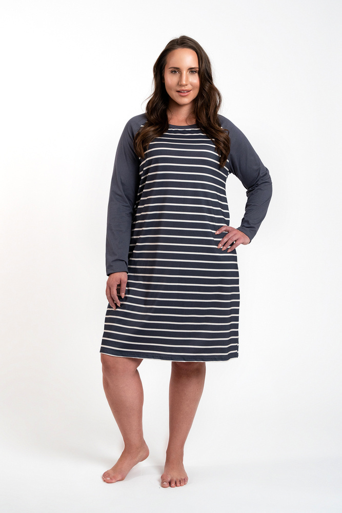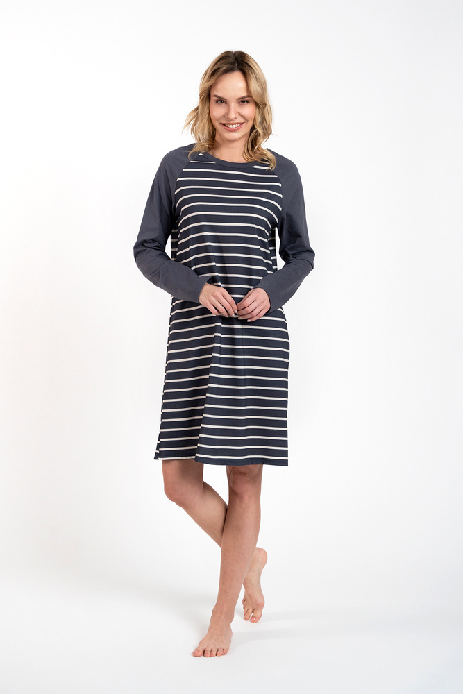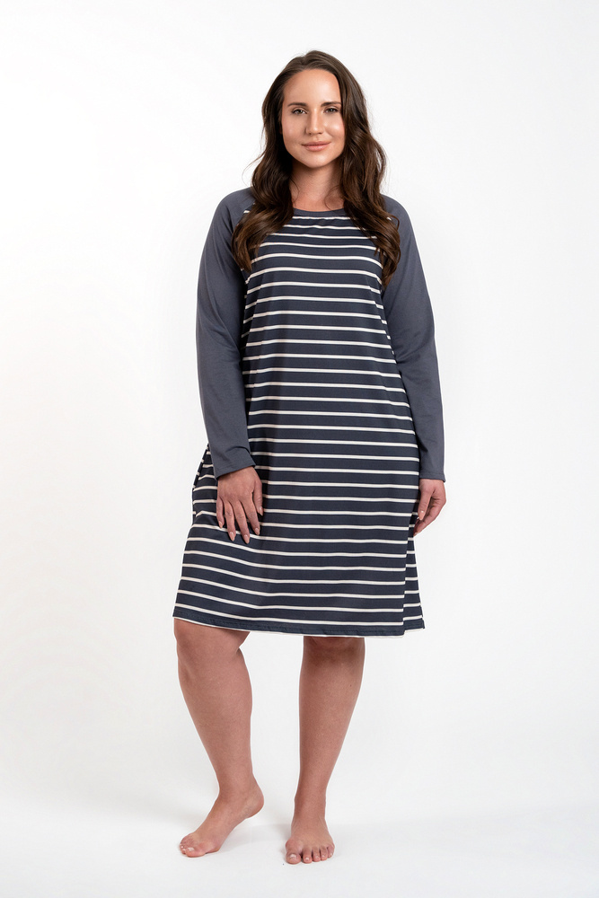 El camisón de algodón para mujer es garantía de la comodidad y libertad que toda mujer desea y merece! La camisa de dormir ligera y holgada y el tejido seguro y agradable para la piel garantizarán la comodidad tanto en las noches frías como en las cálidas. La manga larga y el largo hasta la rodilla hacen que este camisón sea perfecto tanto para estar en casa como fuera, y el atemporal estampado de rayas sienta bien a cualquier mujer. Este camisón de algodón 100% está disponible en dos colores (grafito y capuchino) y en tallas de la S a la XXL.