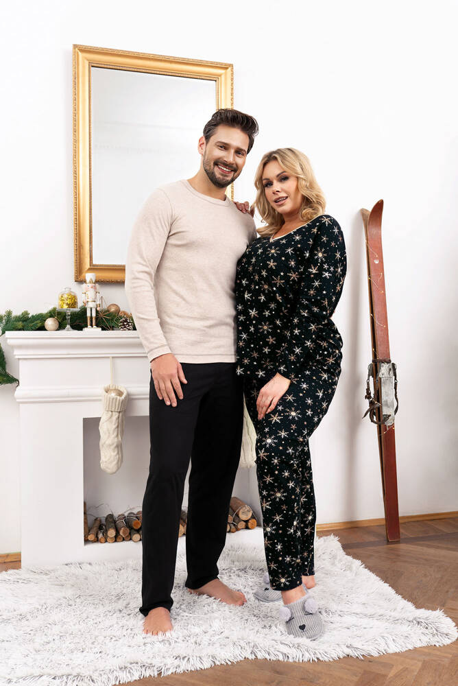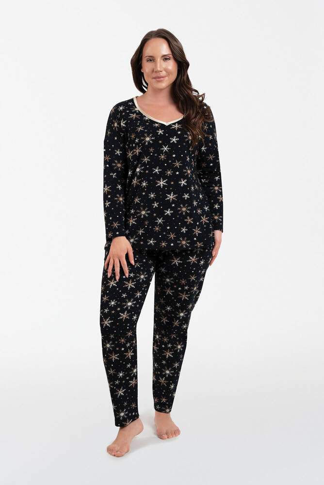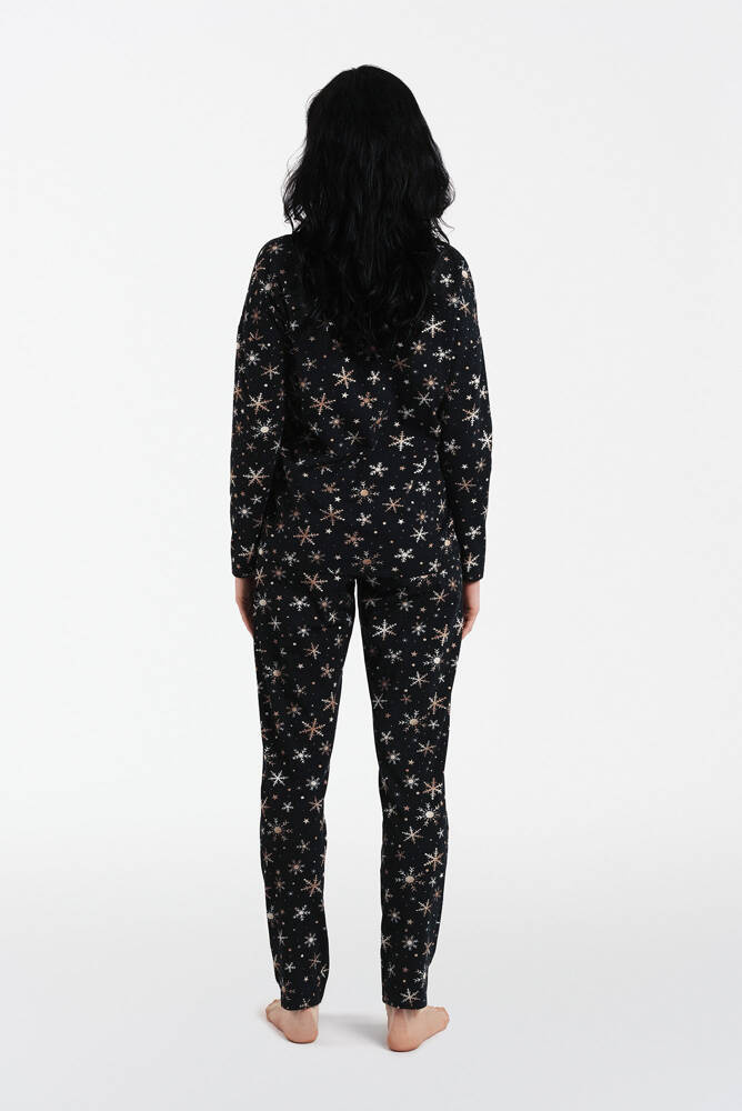 El pijama perfecto para las noches frías? No sólo caliente, sino también... en copos de nieve! Este encantador pijama de mujer decorado con un bonito estampado de copos de nieve hará las delicias de cualquier mujer. El pijama de algodón tiene un corte recto que no limita los movimientos y garantiza la comodidad. Camiseta de pijama de manga larga para mujer con pantalón largo y escote redondo acabado en satén decorativo. Bonitos copos de nieve por todo el pijama. Este moderno pijama de mujer está disponible en las tallas S a XXL, en negro con tonos beige.