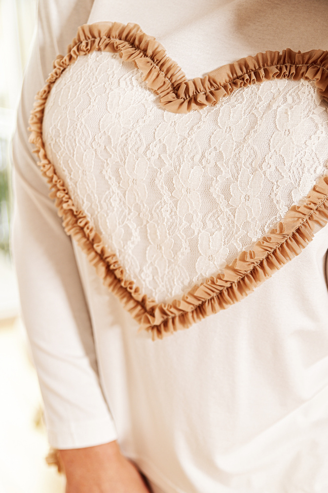 Blusa de manga larga y corte ligeramente holgado, que se adorna con un corazón de encaje envuelto en delicado tul. El conjunto también incluye pantalones largos con bolsillos decorados con volantes de tul.