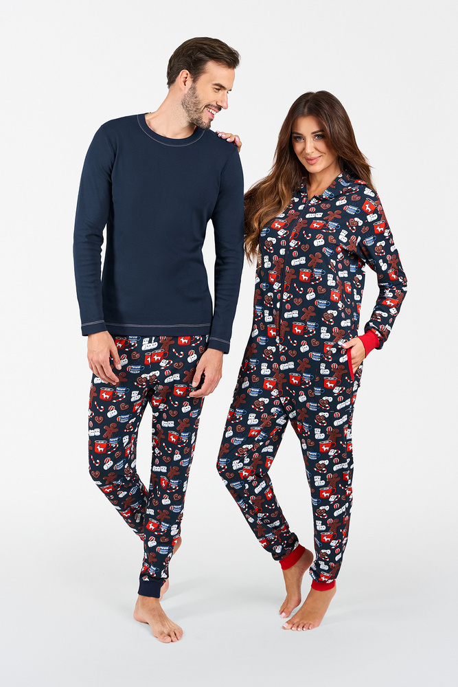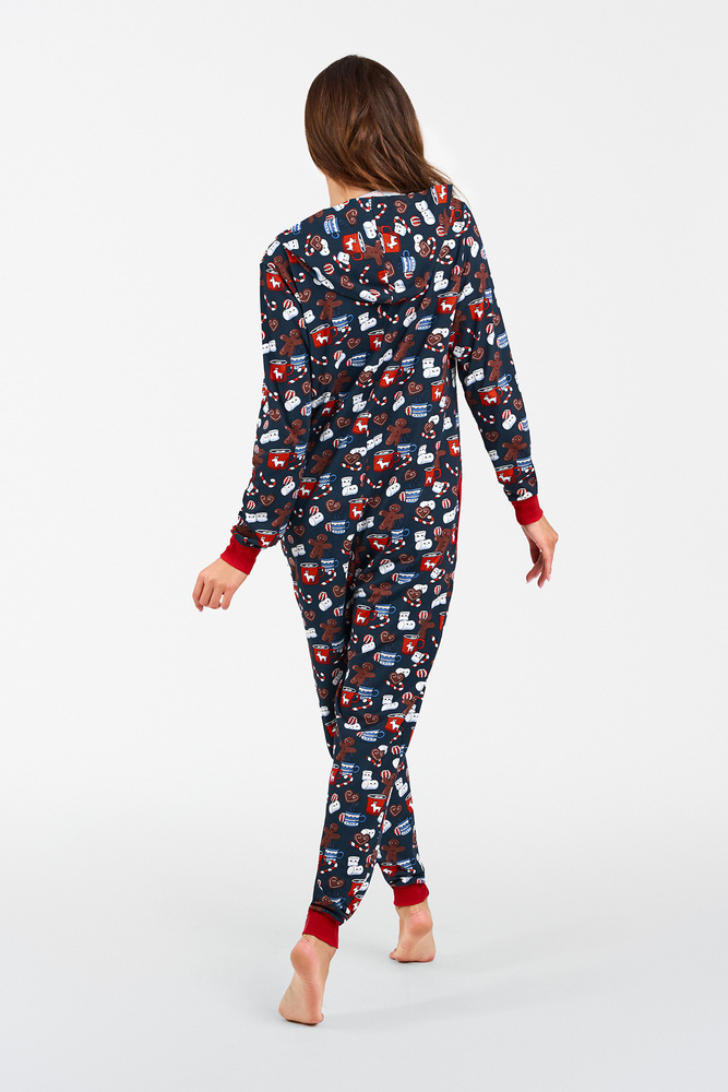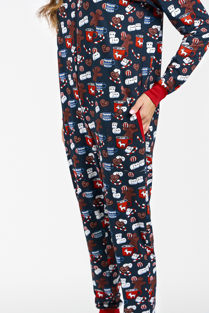 Una prenda así es un verdadero éxito en los últimos años! El pijama-sueño de mujer es ideal para las noches frías. Perfecto para relajarse con una taza de cacao frente al televisor. El mono de algodón para mujer mantendrá tu piel feliz y te proporcionará el confort térmico adecuado, mientras que su corte es una garantía de libertad. Un camisón con cremallera y capucha, con mangas y piernas de canalé, es la alternativa perfecta al pijama clásico: no sólo te resultará muy cómodo, sino también interesante. Está decorado con un bonito dibujo de galletas, perfecto para una tarde de ocio en casa. El mono de algodón para mujer está disponible en las tallas S a XL, en tonos azul marino y rojo.