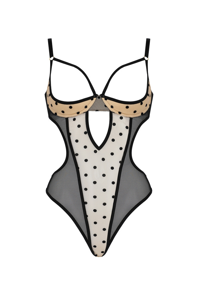 Copas acolchadas abiertas con aros en combinación con tirantes alrededor de los pechos. Recortes que estilizan la silueta y esos lindos puntitos... una maravillosa combinación de materiales de alta calidad que hacen que este body luzca deslumbrante. Modelo disponible en dos colores: negro y beige.