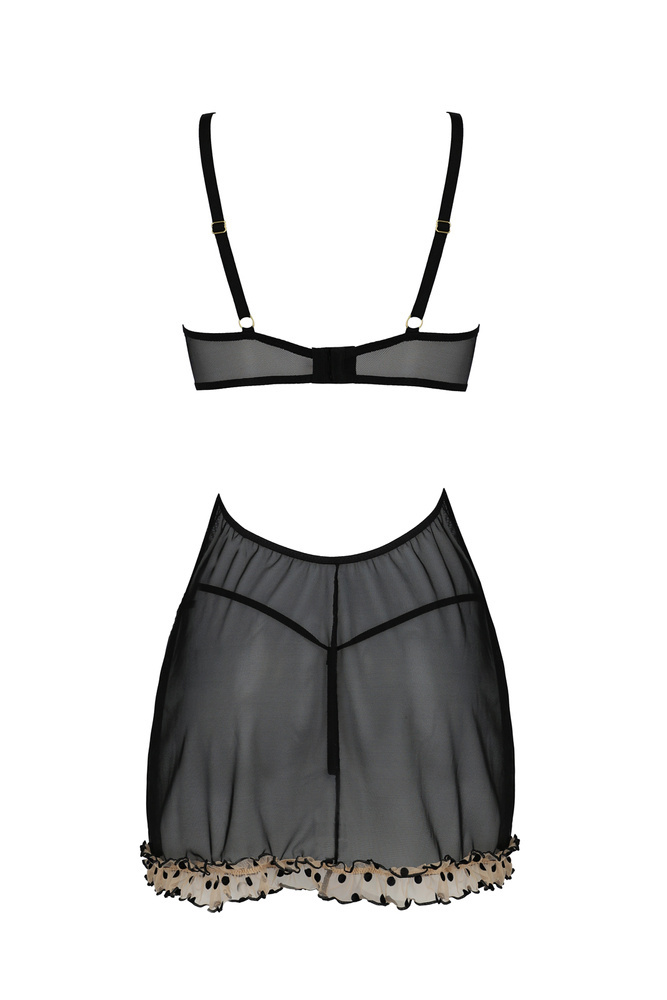 El sensual chemise Martina es una propuesta de la marca Passion. Suave tul, envuelve tu cuerpo y las copas abiertas levantan tus pechos y los exponen frívolamente. Juego disponible en dos colores: negro y beige.