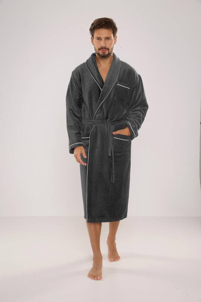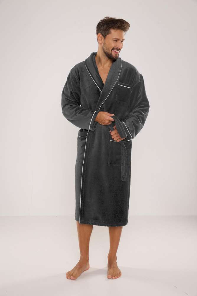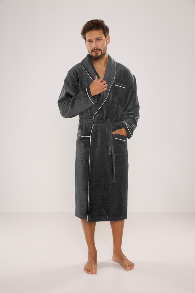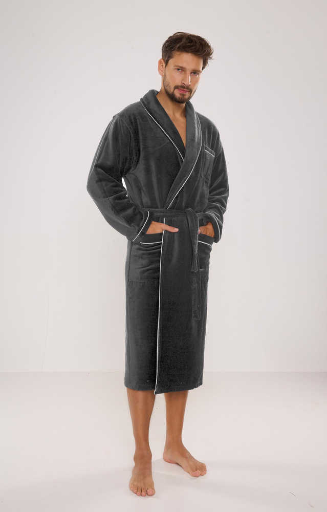 Albornoz largo de terciopelo para hombre. Modelo con cuello chal, anudado a la cintura, con dos bolsillos de parche a los lados y uno a la altura del pecho. Wfabricado con un 50% de suave algodón de rizo. Material agradable con un tacto suave y una excelente absorción de agua.