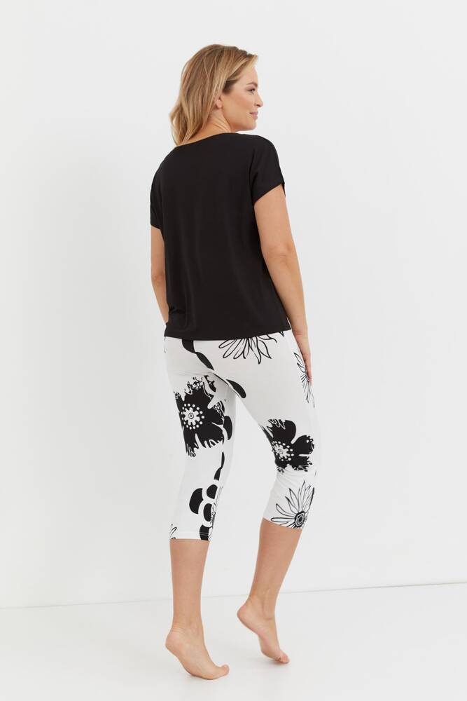 Pijama de dos piezas de De lafense confeccionado en viscosa de alta calidad. Ideal para un sueño reparador y para empezar bien el día con el primer café de la mañana. Camiseta con corto manguito. Completo con pantalón 3/4.