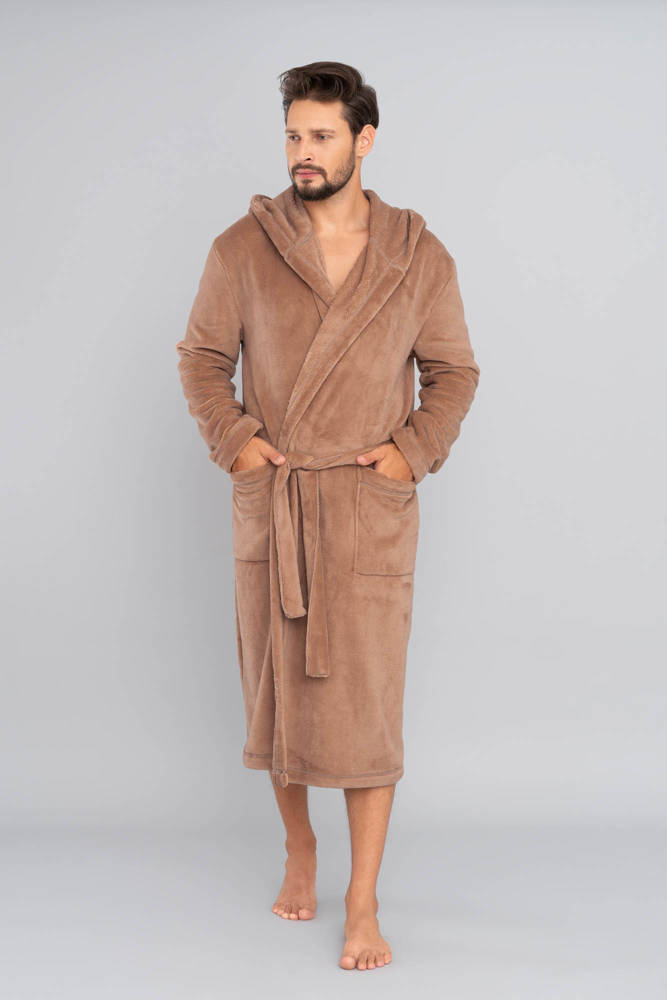 Largo albornoz de hombre con capucha, atado a la cintura.