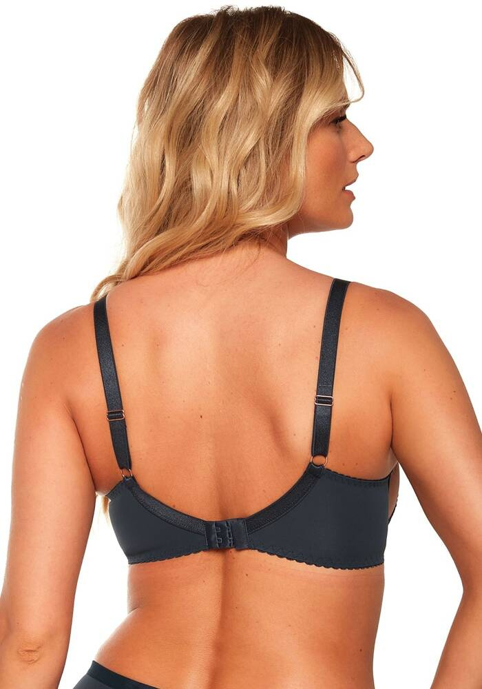 Sujetador suave , azul marino. Copas de suave encaje calado y malla transparente. Circuito en microfibra lisa sin ballenas laterales El sujetador tiene tirantes ajustables no extraíbles. Sujeción con dos o tres ganchos con ajuste en tres fases.