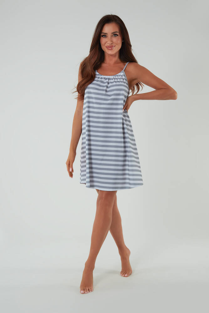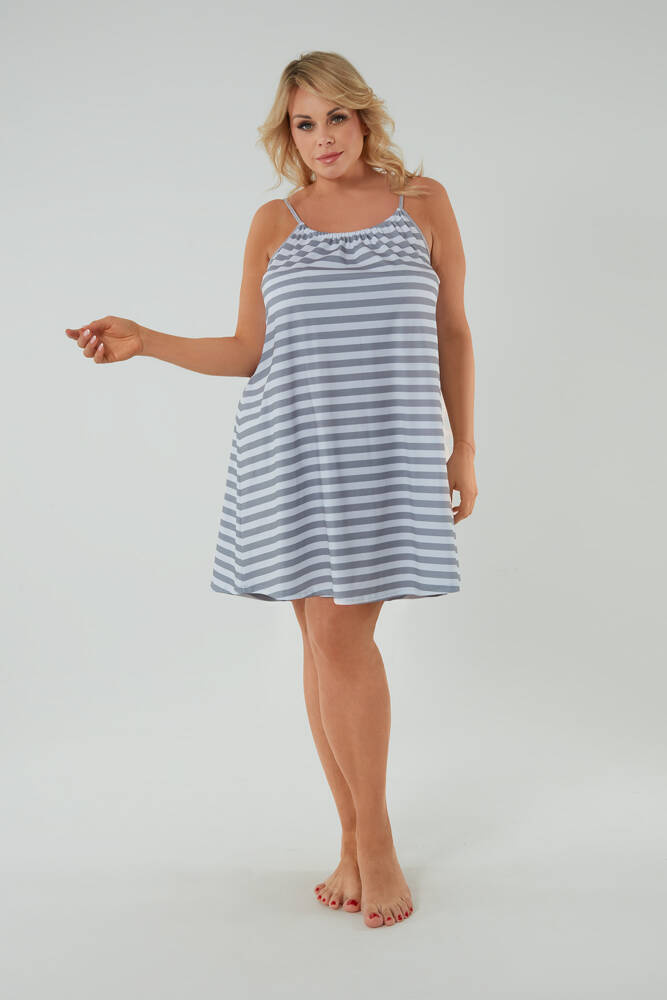 El camisón sin tirantes es una gran elección para las mujeres que valoran la elegancia y un aspecto estilizado. Tiene un corte trapecio holgado que te mantendrá cómoda en las noches más cálidas. Escote redondo superior realzado con pliegues decorativos, tanto delante como detrás. Además, puedes ajustar la longitud de los tirantes y la anchura del escote. Añade que el ligero camisón está decorado con un clásico y atemporal estampado de rayas. Tiene una práctica longitud antes de la rodilla. Nuestro camisón se ha confeccionado en algodón suave y agradable al cuerpo.