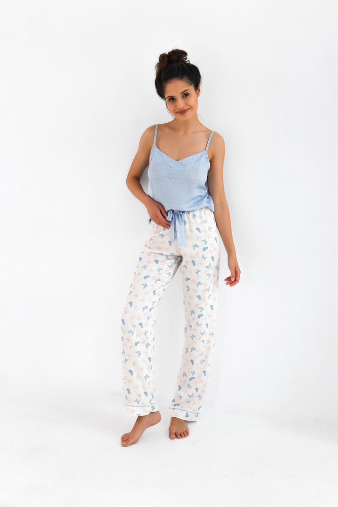 Pijama de verano para mujer con estampado de mariposas. Camiseta sin tirantes. Completa con pantalones largos sueltos. Cintura con elástico y cinta anudada.