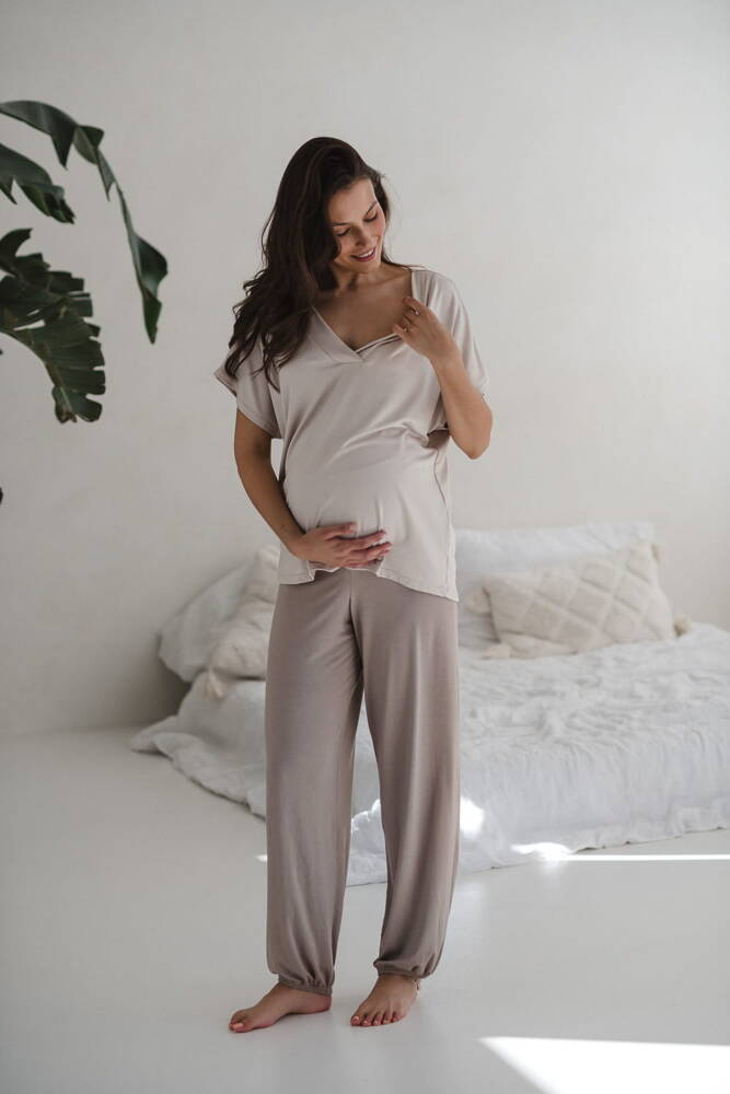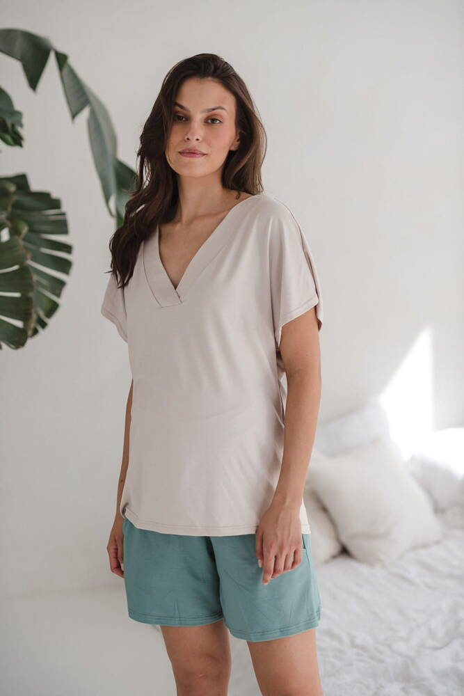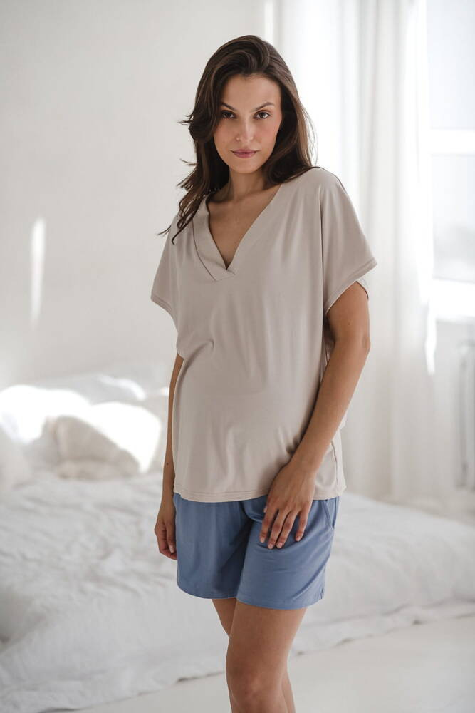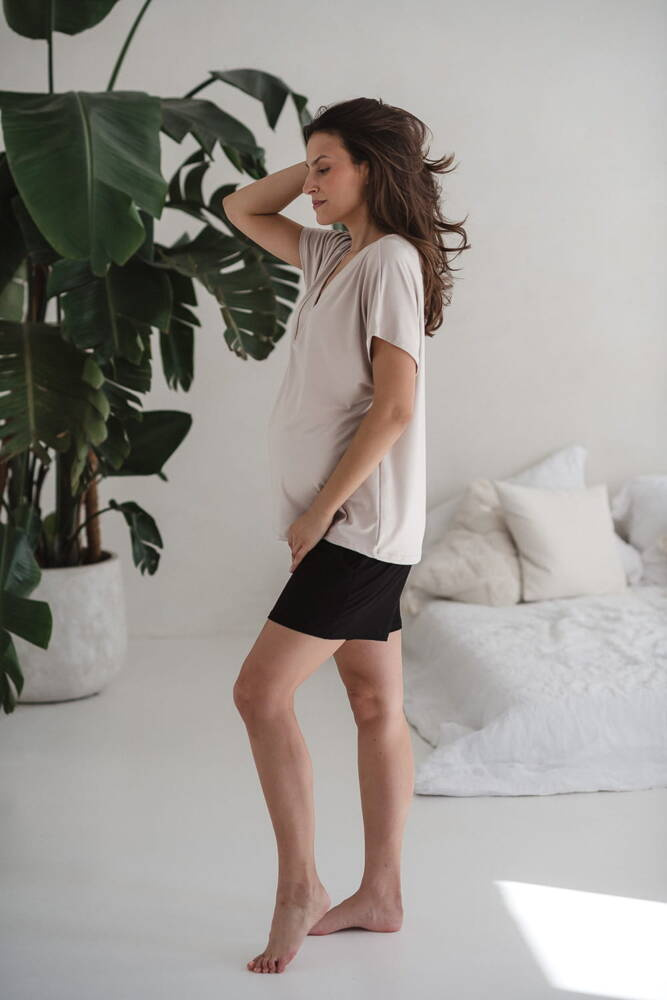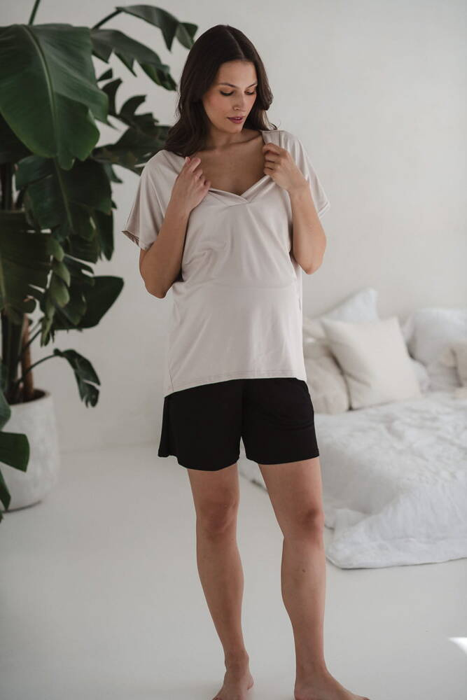 Moon bambusowa bluzka od piżamy ciążowej do karmienia krótki rękaw Milk&Love jasny beżowy