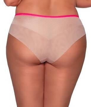 Braguitas de mujer de corte clásico . Parte delantera de malla transparente decorada con un enérgico bordado floral. Doble fondo de microfibra, cintura plana acentuada con banda elástica rosa fluo. Espalda de microfibra y doble malla