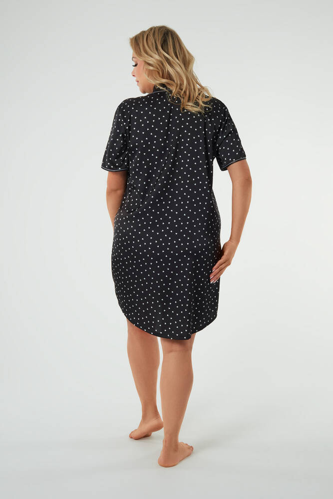 Si te interesan los camisones elegantes, has llegado al lugar perfecto. El camisón de satén para mujer es una opción que añadirá un toque especial a tu vestuario nocturno. Tiene un corte holgado y clásico que te mantendrá cómoda no sólo por la noche, sino también por la mañana. Se trata de un camisón entero desabrochado con prácticos botones automáticos. El escote en V está rematado con un cuello clásico con ribetes distintivos. También hay un pequeño bolsillo en la parte delantera. El conjunto está decorado con un encantador motivo de corazones. Este camisón de satén también tiene mangas cortas, que le irán bien en primavera y verano.