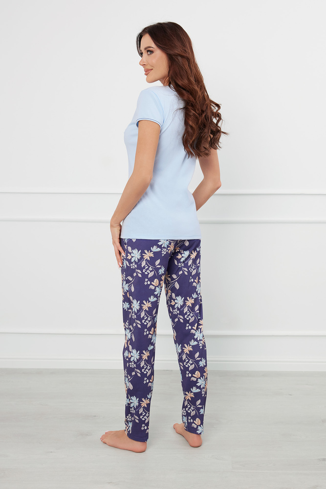 Comodidad y elegancia incomparables en un solo producto. El pijama de algodón para mujer tiene un corte recto ligeramente entallado. La camiseta tiene un escote redondo ribeteado con expresivos ribetes. En el pecho un pequeño bolsillo con un lazo decorativo. El conjunto se completa con un pantalón largo con bolsillos y estampado floral.