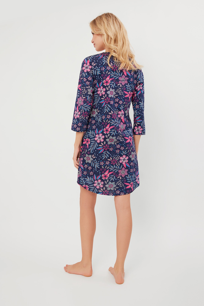 Este camisón de algodón es para las mujeres que quieren aportar un poco de delicadeza a su vestuario de noche. Tiene un corte cómodo y ligeramente acampanado que te mantendrá cómoda mientras duermes. Se distingue por un moderno estampado de flores y hojas de colores, que hace que el conjunto resulte muy original. El camisón desabrochado también tiene un práctico cierre de botones y mangas de ¾ de longitud.