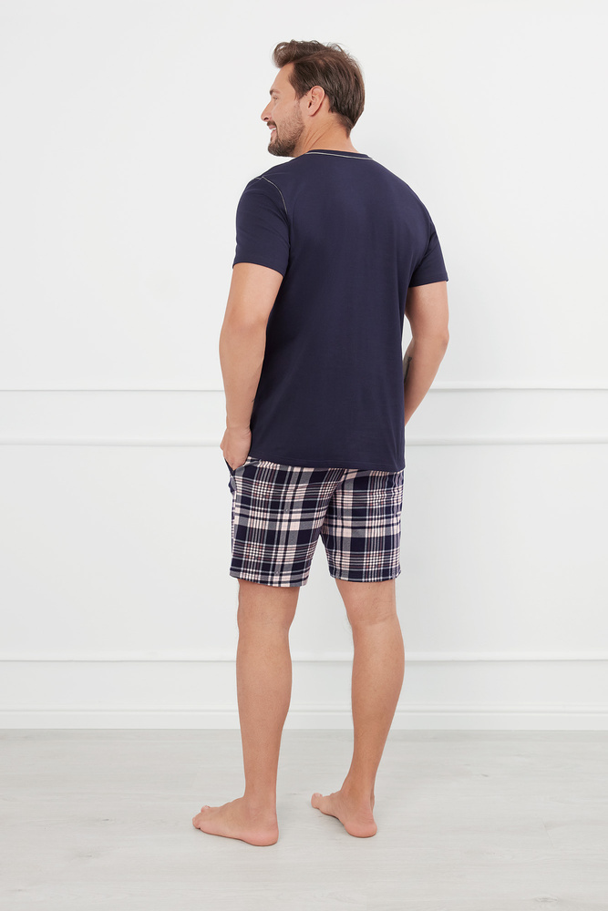 Pijama de hombre de corte sencillo y atemporal. El modelo presenta escote redondo, manga corta y perneras cortas. La parte superior es maciza, mientras que la inferior es estampada, variada con un dibujo a cuadros. Las costuras en contraste añaden clase y estilo. En los laterales, hay dos bolsillos abatibles. La ventaja del pijama corto de hombre es también el material de algodón: duradero, suave y que proporciona una buena circulación del aire.