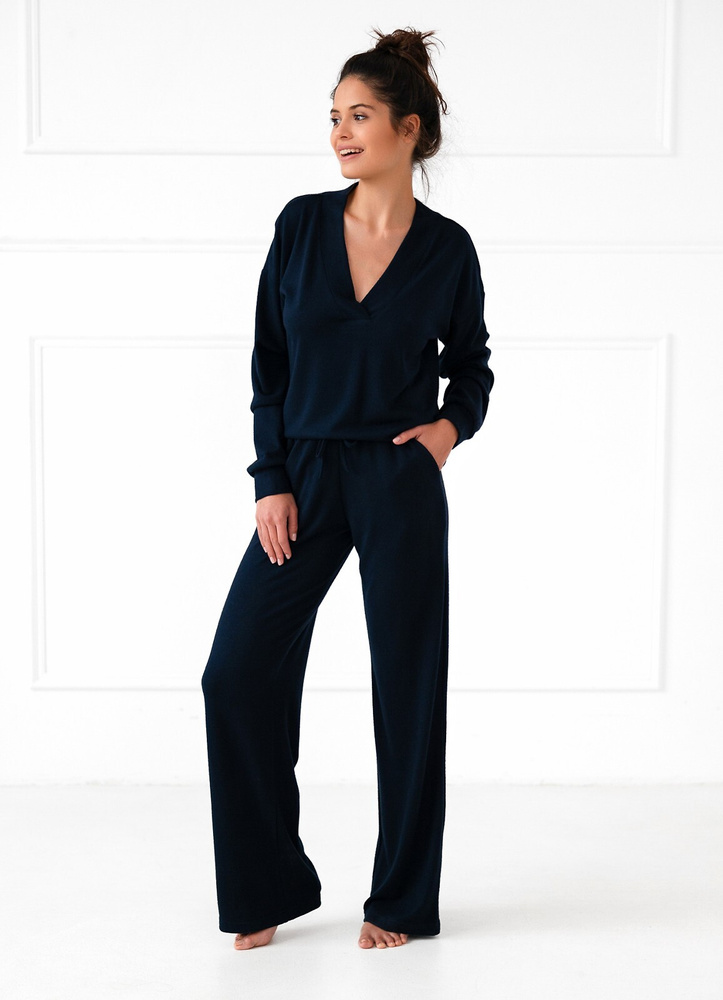 Conjunto de ropa de casa para mujer. Fabricado en tejido de punto de alta calidad con adiciones de viscosa. Camiseta de manga larga, escote en V. Completa con pantalones largos sueltos. Cintura elástica.