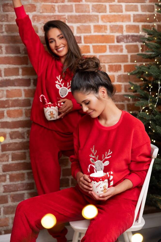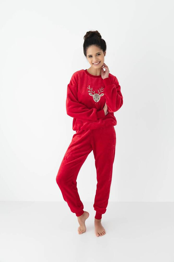 Pijama femenino de tejido suave de alta calidad. Camiseta de manga larga, decorada con un motivo festivo.Completa con pantalones largos y sólidos. Pantalón acabado con cordón. El conjunto realza perfectamente las formas.