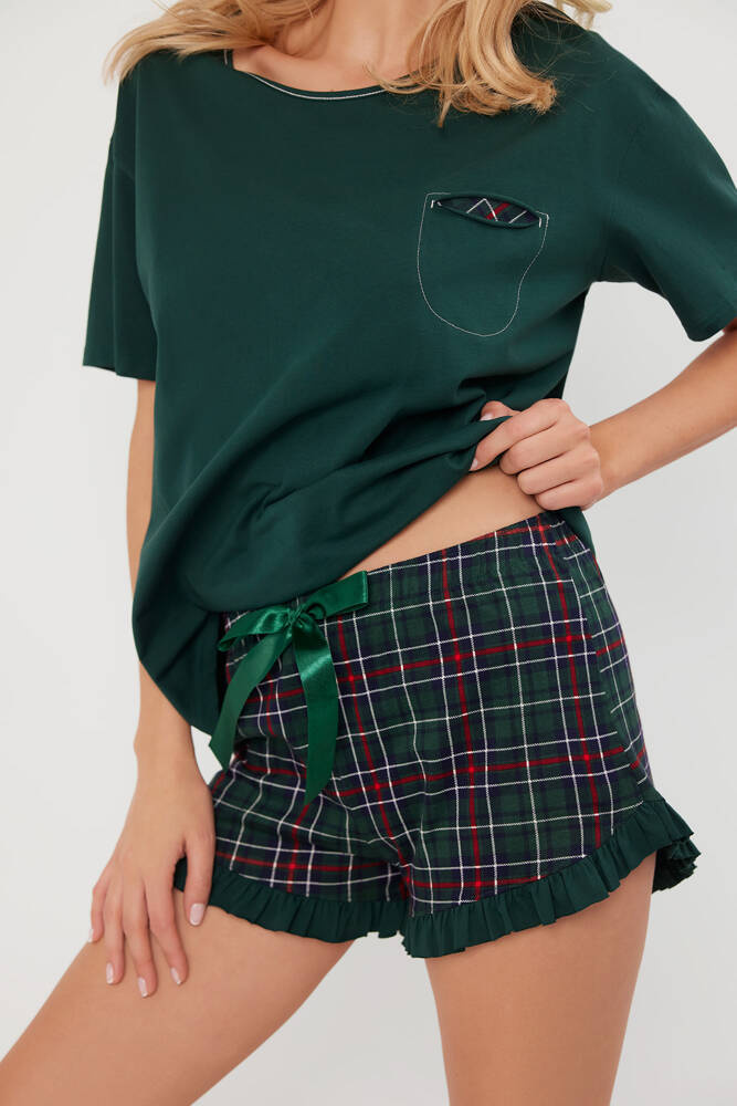 Estos pijamas de mujer son la esencia del estilo. La blusa de pijama tiene un corte cuadrado que se adapta perfectamente a la silueta y se presenta en un color liso. Presenta un bolsillo a la altura del pecho, puntuado con un detalle a cuadros e hilo blanco, al igual que el escote redondo. El conjunto se combinó con unos pantalones cortos, también a cuadros. Están rematados con un volante decorativo y un gran lazo de satén. 100% algodón.