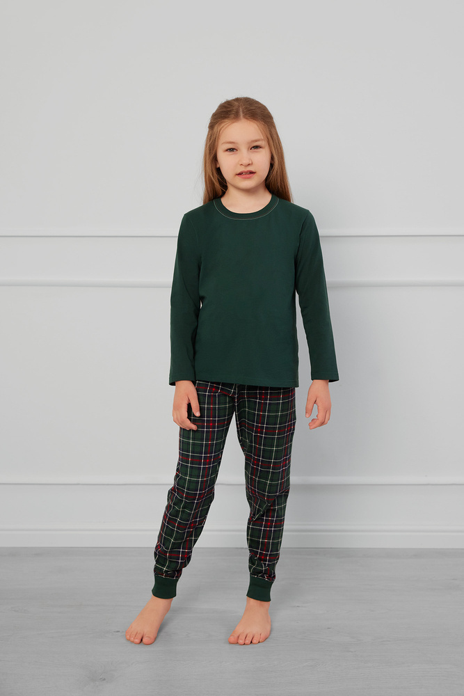 Este pijama infantil de líneas rectas se compone de una blusa de color liso con escote redondo y un pantalón a cuadros con un práctico cordón en la cintura. El corte clásico no limita los movimientos y el tejido suave y de alta calidad no irrita la piel, garantizando calor y comodidad durante toda la noche.