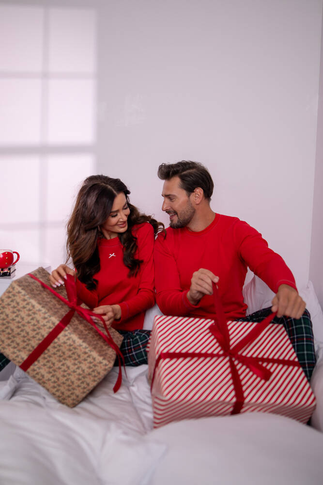 Los pijamas de Navidad para mujer son la solución para los amantes de la temática navideña. Tiene un corte sencillo y cómodo para dormir cómodamente. La parte superior es una blusa lisa con mangas raglán largas ribeteadas con hilo de contraste. Se remata con un pequeño escote redondo con ribetes. Debajo hay un lazo decorativo. La parte inferior del conjunto se compone de un pantalón largo realzado con un estampado de cuadros atemporal. El conjunto está fabricado en suave y agradable al tacto algodón 100%.