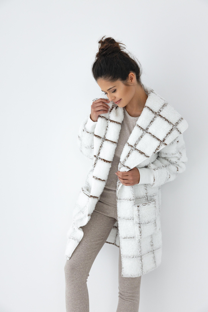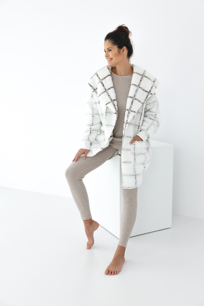 Cómodo albornoz de señora. De punto suave y esponjoso. Modelo a medio muslo, corte recto con mangas largas. A la altura de la cadera tiene dos bolsillos. Corte muy cómodo, suavemente ajustado al cuerpo. Atraerá a las mujeres amantes de la suavidad y la libertad.