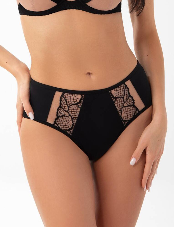 Braguita de bikini de microfibra. Revela parcialmente y realza los glúteos. Inserciones de tul bordado en la parte delantera. Lomo liso