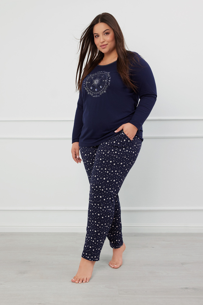 Elegante pijama de mujer adornado con un motivo cósmico. Toda la pieza está hecha de suave jersey de algodón. Tiene un corte clásico y cómodo. El top de moda, con estampado de fases lunares, combina a la perfección con la braguita estampada de estrellas. Toda la pieza tiene mangas largas y piernas largas. Se trata de un pijama femenino de algodón, caracterizado por su suavidad, tersura y gran resistencia al estiramiento.