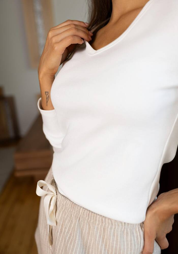 Pijama de señora de algodón de alta calidad. Camiseta de manga larga, escote en V.