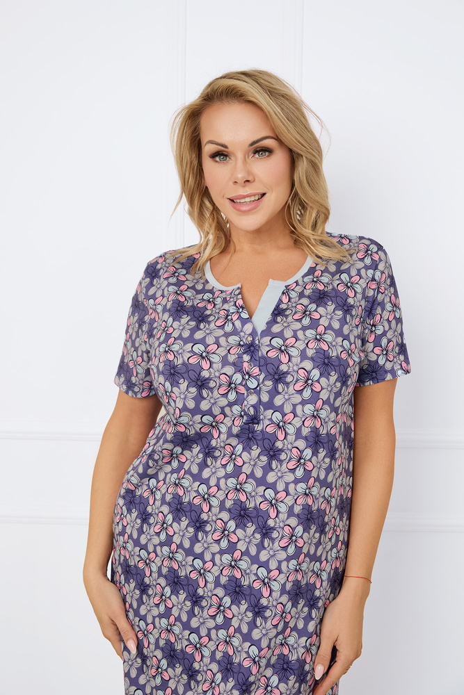 El camisón de mujer es una combinación de romanticismo y elegancia. Tiene un cómodo corte de manga corta. El top es variado con escote redondo con ribetes en contraste y un distintivo cierre de botones de polo. Un estampado floral, delicadamente adornado en toda la prenda, confiere una delicadeza femenina a su estilo. Este práctico modelo hasta la rodilla está confeccionado en suave algodón 100%.