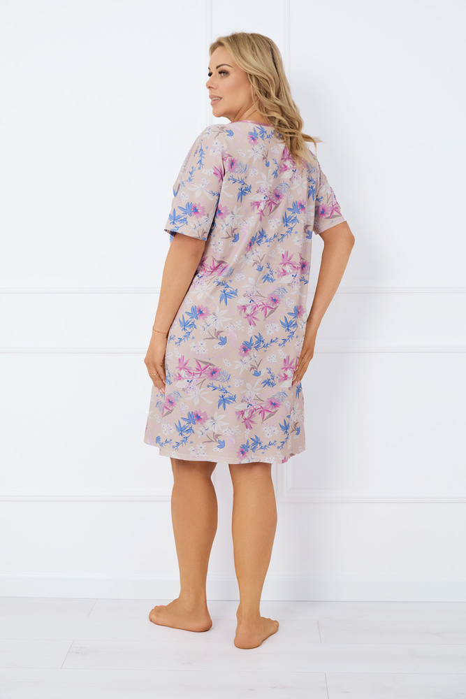 Este camisón de manga corta para mujer es una armonía de estilo, gracia y elegancia. Combina un corte cómodo para una total libertad de movimientos con un suave algodón 100% con estampado floral en tonos pastel. La camisa tiene cuello de pico, realzado por un ribete brillante.