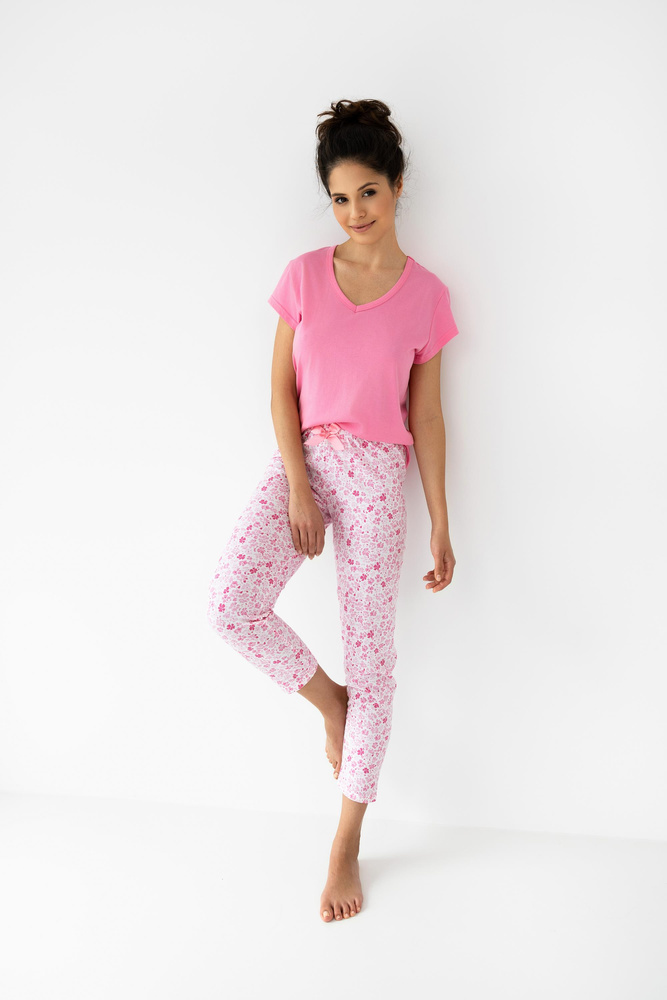 Pijama de verano para mujer con estampado floral. Camiseta de manga corta, escote en V. Completa con pantalones 7/8 estampados. Cintura elástica y lazo de satén.