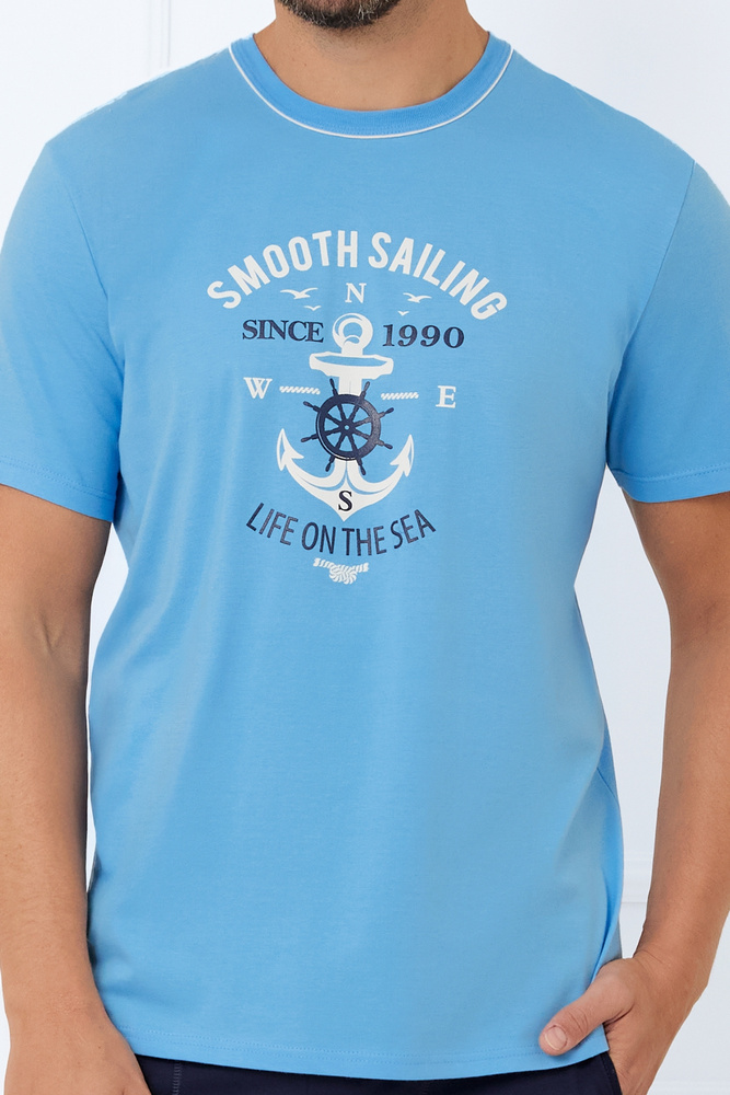 Pijama corto de estilo náutico para hombre en 100% algodón. Se distingue por su corte sencillo y cómodo. La camiseta de manga corta y escote redondo, ribeteada con ribetes, está decorada con un estampado de anclas y elegantes letras que acentúan su carácter. Completan el conjunto unos sólidos pantalones cortos con bolsillos.