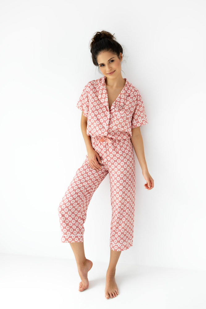 Pijama de mujer de manga corta con botones y estampado floral. Se completa con un pantalón holgado de 3/4 de largo. Cintura elástica y lazo de satén.