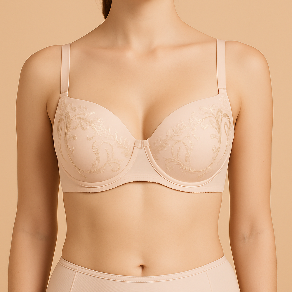 VB-474 de Vena es un sujetador de copa entera en tono nude, diseñado para mujeres que aprecian la comodidad y la elegancia. Las copas lisas y bien formadas con aros proporcionan una sujeción ideal, mientras que los llamativos bordados añaden un sutil encanto. Modelo ideal para llevar a diario y bajo prendas entalladas.