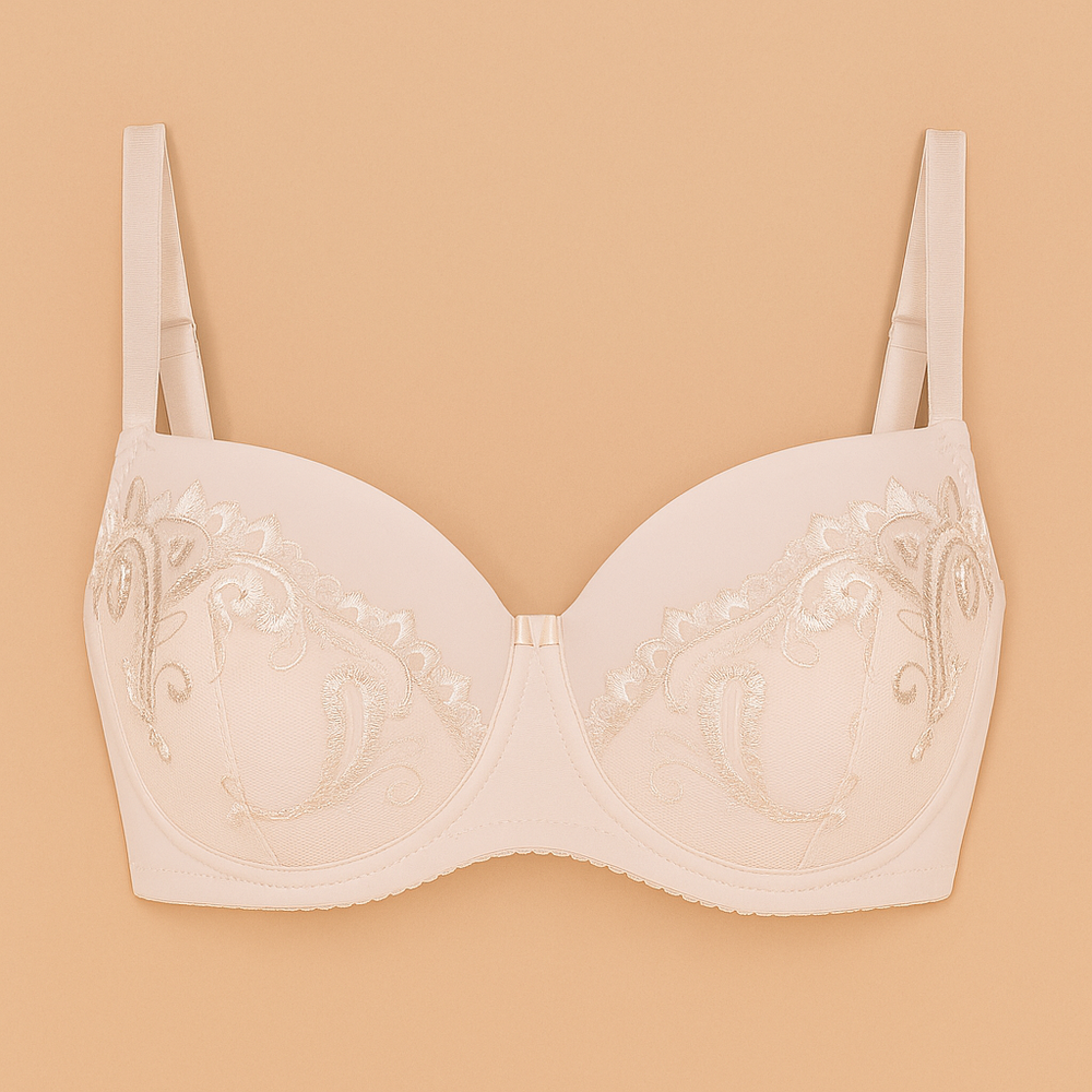 - Sujetador de copa entera en color carne con encaje y copas llenas. Excelente sujeción y comodidad durante todo el día.