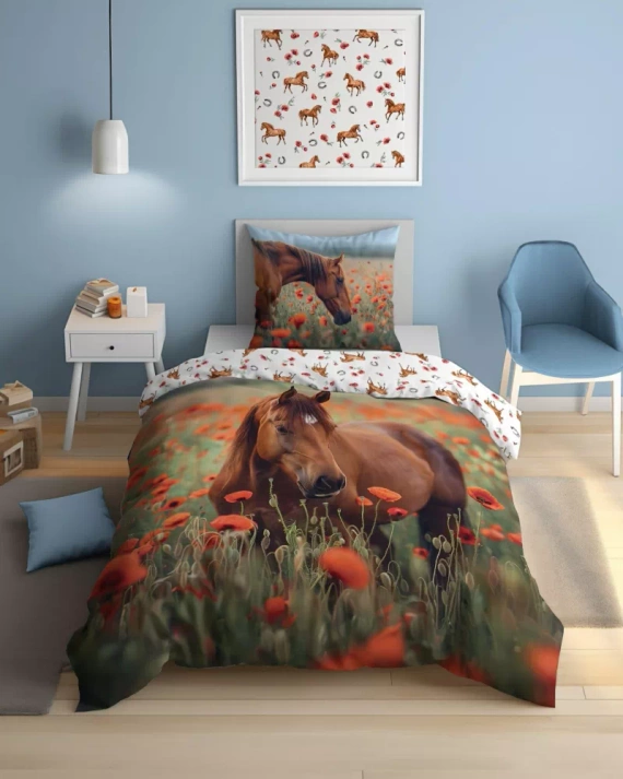 5550 A Fluo 95 Ropa de cama luminosa caballo oscuro en amapolas| 100% algodón | Para niños Detexpol