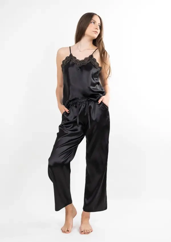 Top negro con tirantes ajustables y pantalón largo y holgado con cómoda cintura elástica. El satén ligero y vaporoso envuelve suavemente el cuerpo para ofrecer comodidad y un aspecto sensual.