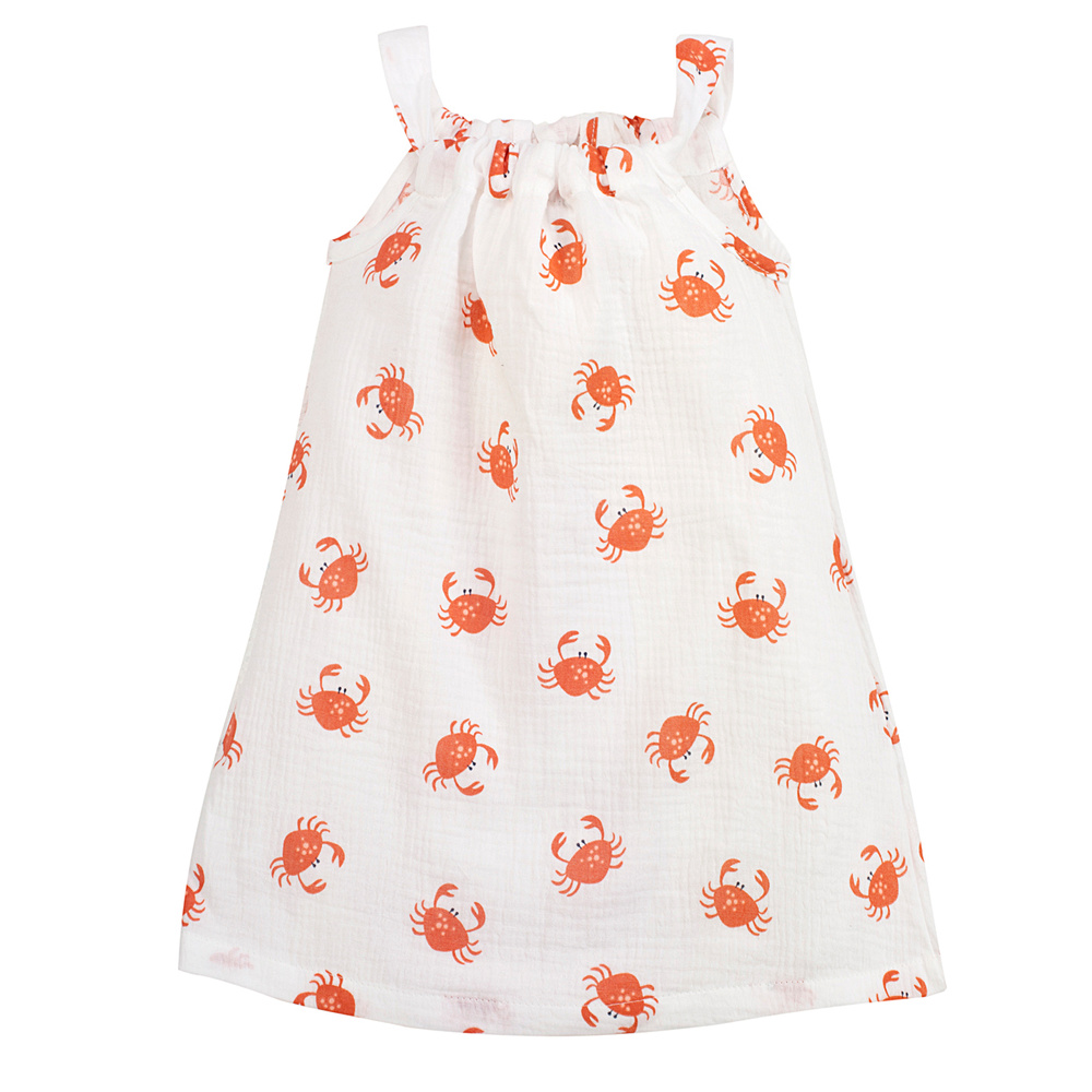 Buscando el vestido perfecto para una niña para el verano? Vestido de muselina CRABSes un tiro en el brazo! Fabricado con materiales naturales y suaves 100% algodón muselina, es ligero, transpirable y muy agradable para la piel del bebé.