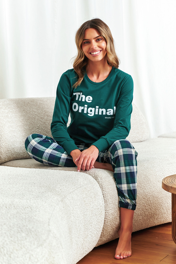 El pijama de mujer Doctor Nap 7340 es un cómodo conjunto perfecto para todas las estaciones. Blusa de algodón de manga larga con estampado "The Original" combinada con un pantalón de cuadros para crear un look clásico y moderno a la vez. Y lo que es más importante: el modelo 7340 se puede completar como pijama para toda la familia: mamá, papá y el bebé pueden dormir en conjuntos a juego! La producción polaca es garantía de alta calidad y cuidadosa elaboración.