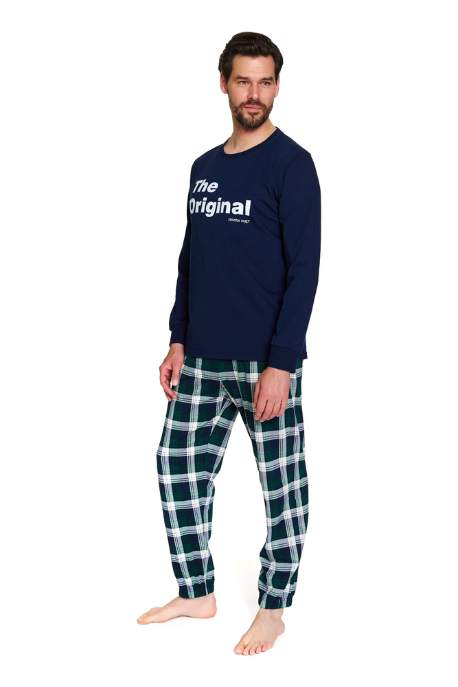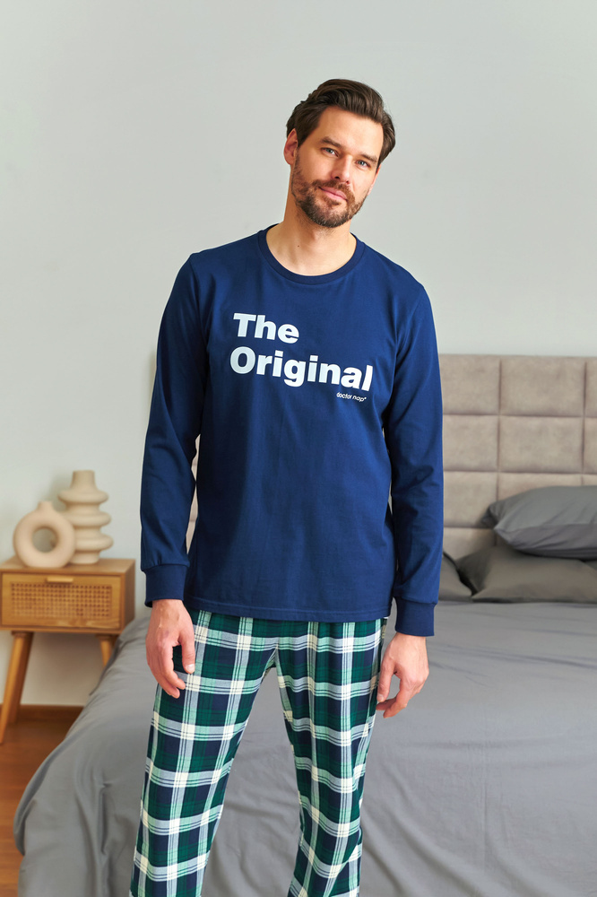 El pijama para hombre Doctor Nap 7341 es un elegante conjunto perfecto para todas las estaciones. Compuesto por una blusa de algodón de manga larga con estampado "The Original" y un pantalón clásico de cuadros, rematado con un dobladillo de canalé. Este modelo forma parte de la colección familiar: puedes elegir conjuntos a juego para tu pareja y tu hijo, creando un conjunto cohesionado y a la moda para las veladas o las fotos juntos. La fabricación polaca garantiza calidad y comodidad.
