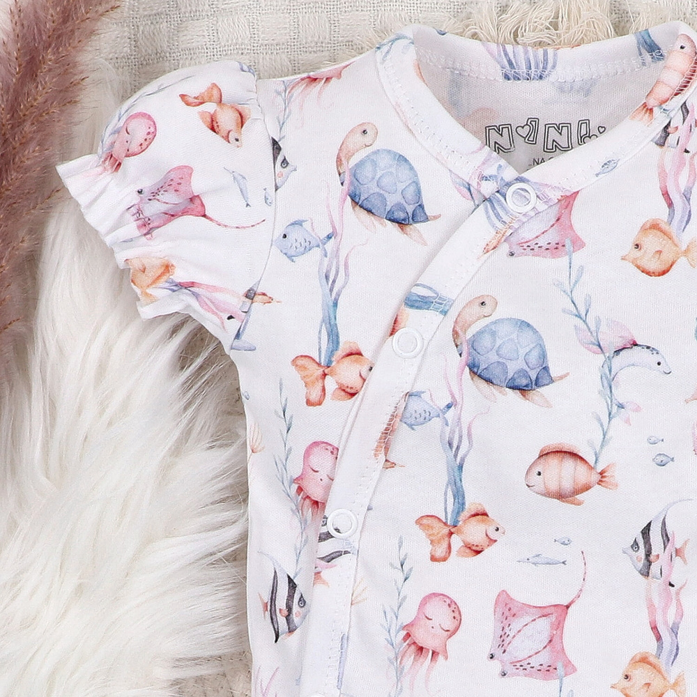 - Nini body Underwater World – 100% bawełna organiczna, krótki rękaw, kopertowe, wygodne napy.