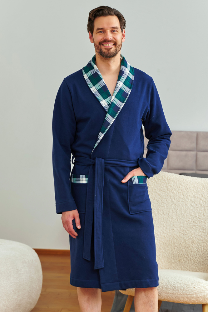 El modelo 7366 es para el hombre que aprecia tanto la comodidad como el buen estilo. Fabricado en algodón de alta calidad, el albornoz envuelve el cuerpo en un material suave y natural. El corte clásico en azul marino intenso se complementa con detalles de tejido de cuadros escoceses en el cuello y los bolsillos. Un lazo en la cintura garantiza un ajuste ceñido, mientras que los prácticos bolsillos acentúan la funcionalidad del modelo. Ideal tanto para las mañanas frescas como para las tardes con un libro o una serie. Lujo doméstico en estado puro.