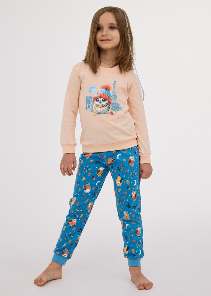 La parte superior del pijama tiene manga larga, y el conjunto se mantiene en un dulce tono melocotón, que gustará a todas las jóvenes. Un encantador estampado de inspiración parisina añade un toque único al diseño general. Los pantalones de corte clásico con cintura elástica garantizan la comodidad durante toda la noche.