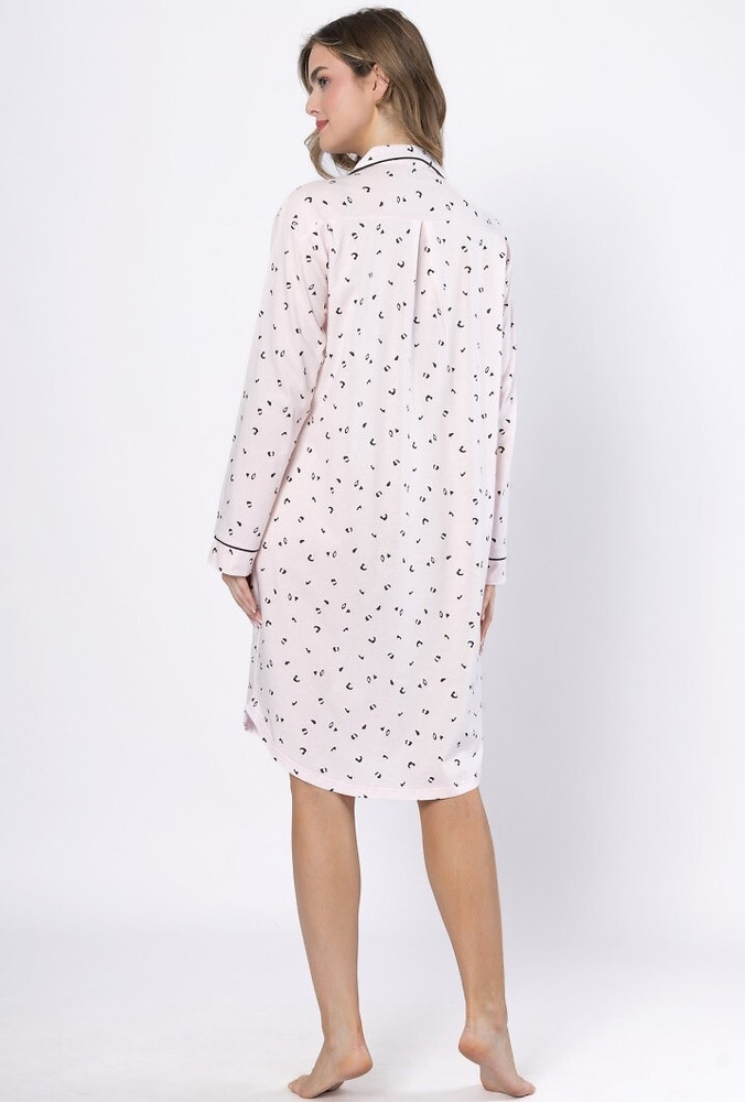 La camisa tiene manga larga, lo que la hace ideal para las noches más frías. Cierre con botones da al conjunto un toque elegante y es también una solución práctica, por ejemplo, para las madres lactantes. El corte es relajado sin ser restrictivo, y los delicados adornos añaden sutileza y encanto femenino.