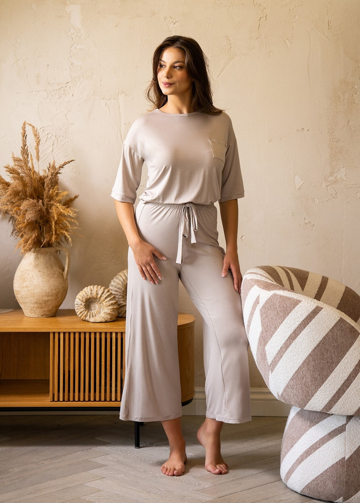 Blusa con manga corta y los pantalones a juego crean un conjunto armonioso, ideal para las noches de primavera y verano. El modelo se distingue por su corte femenino, que no restringe los movimientos, a la vez que se ajusta bien a la silueta.