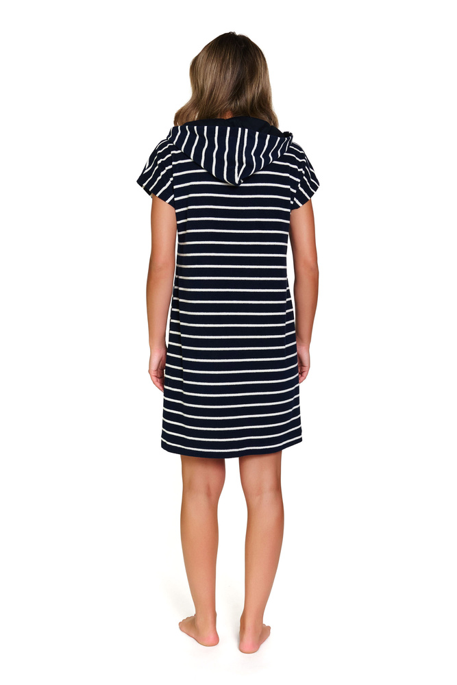 Doctor Nap 7355 MARINE es una bata femenina única que combina la ligereza de la ropa de verano con la funcionalidad de la ropa de casa. Fabricado con un tejido de punto de alta calidad (80% algodón, 20% poliéster), perfecto para los días más cálidos. La bata tiene capucha, un práctico bolsillo canguro grande y mangas cortas, lo que le da un toque desenfadado y juvenil. Las rayas de estilo naval realzan su aire festivo. Ideal para llevar después de nadar, en la playa o para relajarse en casa.